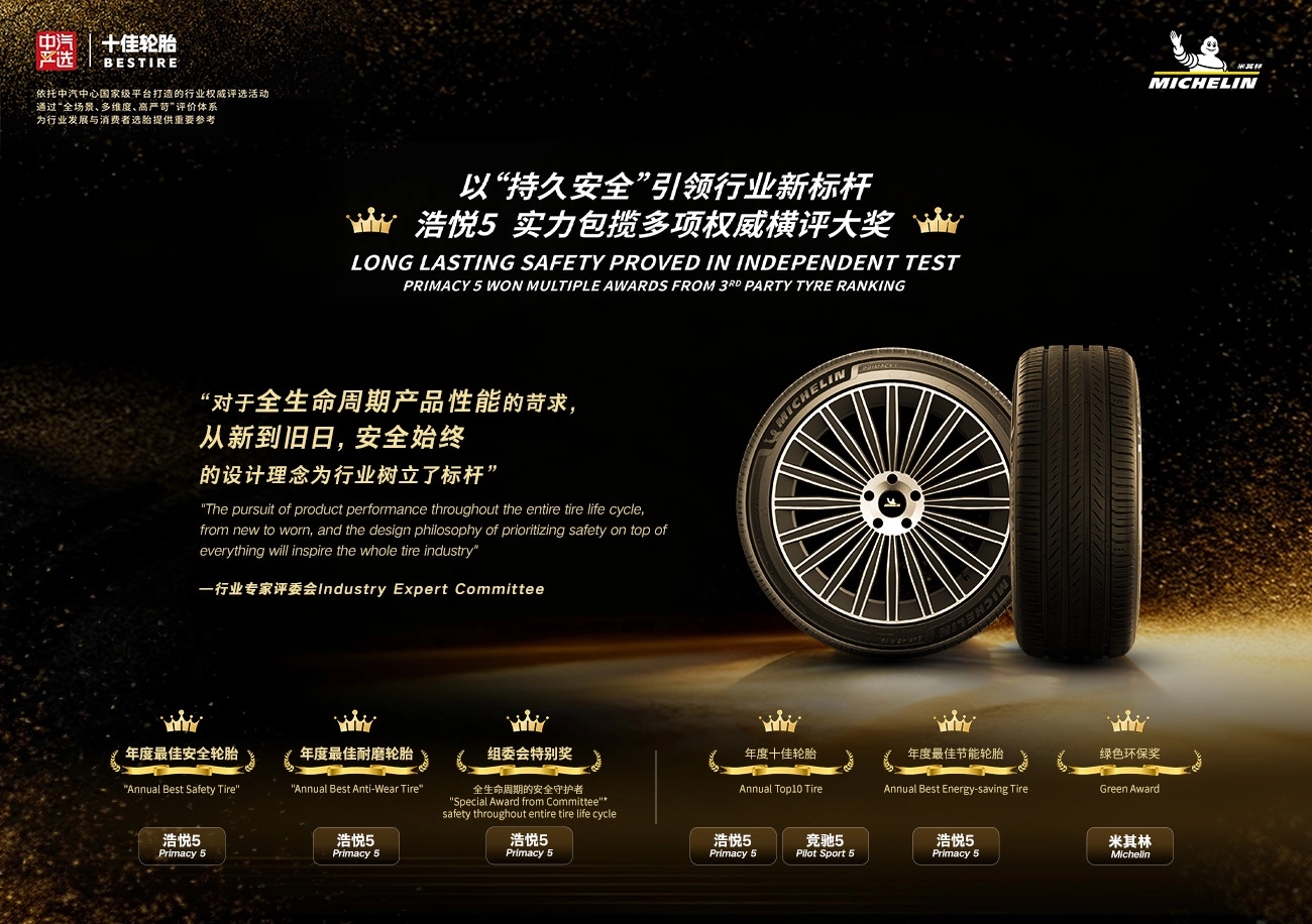 在近日揭晓的2025中汽严选年度十佳轮胎评选中,米其林凭借卓越的产品性能与前沿的绿色创新实力,一举斩获“年度十佳轮胎”及五个单项大奖。米其林浩悦五代与竞驰5从30 款参选产品中成功突围、双双入选 “年度十佳轮胎”,使米其林成为本次评选中唯一独占“两席”的品牌,同时斩获“绿色环保奖”。值得一提的是,米其林还以“从新到旧,安全始终”的全使用周期安全理念,荣膺“组委会特别奖”——该理念在浩悦五代产品中得到集中体现,充分彰显了主办方对其安全理念创新性与实践价值的高度认可。